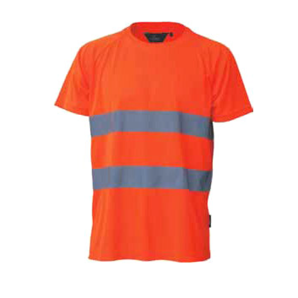 La t-shirt alta visibilità arancio fluo è un capo realizzato in tessuto tecnico piquet 100% poliestere, materiale che garantisce una buona traspirabilità.E’ dotata di due bande rifrangenti cucite sul petto e sulla schiena, e il collo ha le cuciture interne ricoperte per un extra confort.
